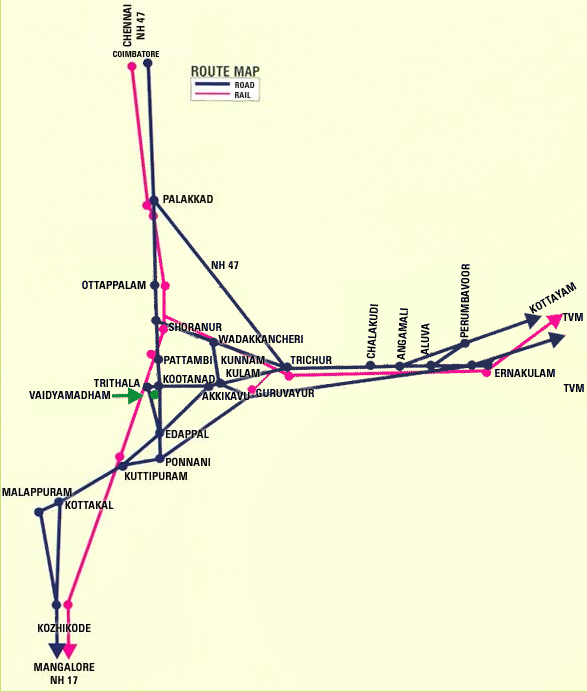 Nearest railway station (9 Km) is Pattambi, 15 kms away from Shornur towards Mangalore . Koottanad is the nearest recognized bus station (two and a half Km from vaidyamadham) lying in the Trichur (40 Km)-Guruvayoor (25Km)-Pattambi (9Km)-Palakkad(65Km) route. Edappal (NH 17) is just 20 Km away. Karippur (Kozhikode) 65 Km, Nedumbasseri (Cochin) 90 Km and Coimbatore 120 Km are the nearest airports. Boarding and Lodging facilities are available at Hotel Devalokam (Koottanad), and Hotel Rajaprastham (Pattambi). Govt Rest House Trithala also provides accommodation facilities but capacity is very much limited. |