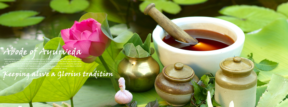 Vaidyamadham is one of the famous Ashtavaidya group of families in Kerala. As said before, they are the only one family belonging to the Bharadwajeeya group. It is believed that this family was brought here as Saala Vaidya by none other than the famous Mezhathole Agnihothri who conducted 99 soma yagas to re-establish the Vedic Karma and Yagnya Culture of our country. Saala vaidya is a special status conferred on them who is responsible for health of the participants of yagnya.